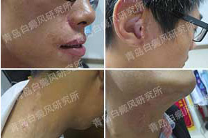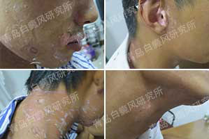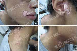 病史:六年前,患者发现嘴角、耳朵及颈部出现色素脱失白斑,曾到当地医院就诊,口服中药及外涂自制药水,大概治疗半年多,白斑无明显变化,故来我院就诊。