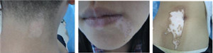 皮肤上的白色、乳白色斑界限清楚,大小形态不一,白斑处毛发可变白。色斑皮肤无萎缩、硬化及脱屑等变化。多见于面、颈、手背等部位。无自觉症状。