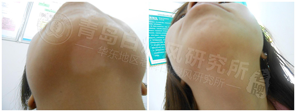 看皮损形状:白斑呈不规则片状,边界清楚,表面光滑无皮屑,而扩散期的白斑边缘模糊。