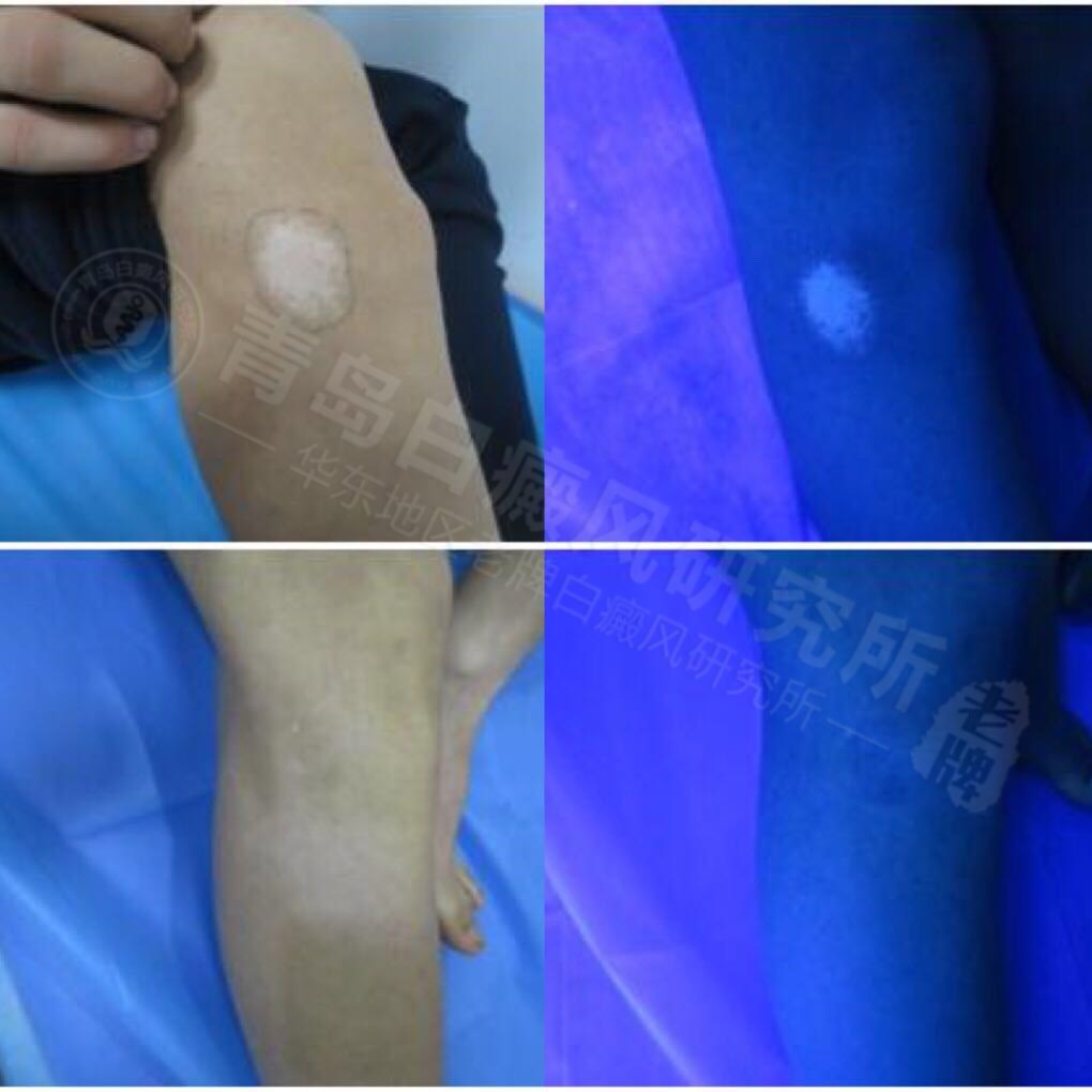 临床上肉眼有时难以发现正常皮肤特别是白皙皮肤上的浅色斑,而Wood灯下白癜风的皮损为纯白色,与周围正常皮肤对比鲜明,界限清楚。尤其当白斑中开始出现毛囊复色时,复色初期在自然光线下表现并不明显,但可以借助Wood灯来观察而得以确认。